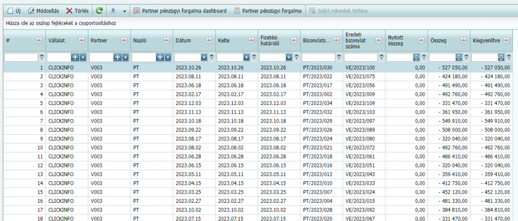 A ClickInfo Pénzügy táblájához az alábbi kimutatások tartoznak:
