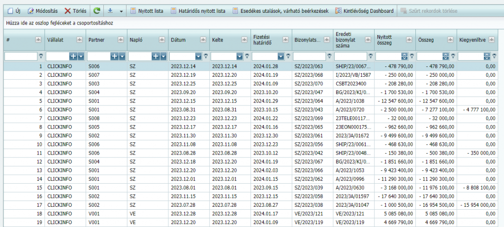 A pénzügyi csomagba tartozó egységesített Kintlévőség adattábla tételesen tartalmazza az egyes partnerekhez (vevőkhöz és szállítókhoz) kapcsolódó nyitott tételeket a következő adatokkal: partner, napló, teljesítési dátum, számla kelte, fizetési határidő, bizonylatszám, eredeti bizonylat száma, bruttó összeg, nyitott összeg, kiegyenlített összeg. A táblázatban Ön tetszőlegesen csoportosíthatja és szűrheti az adatokat a program webes felületén.