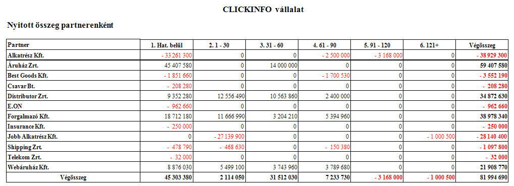 A Határidős nyitott lista szűrési feltételei a Megjelenítési paraméterekben térnek el a Nyitott lista riporttól. A riport táblázatos formában, kategóriák szerint jeleníti meg, hogy egy adott dátumhoz (fordulónaphoz) viszonyítva milyen kategóriába estek nyitott számláink.