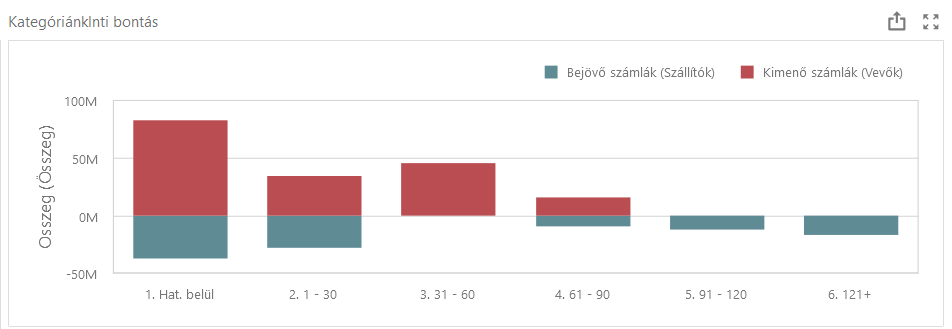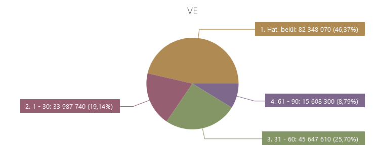 A megjelenítés után grafikonok és kördiagramok mutatják be szemléletesen kintlévőségeinket. A szűrési paraméterek segítségével pontosíthatjuk az adatokat, vagy a kördiagramok egy-egy szeletére kattintva fókuszálhatunk egyes részletekre.